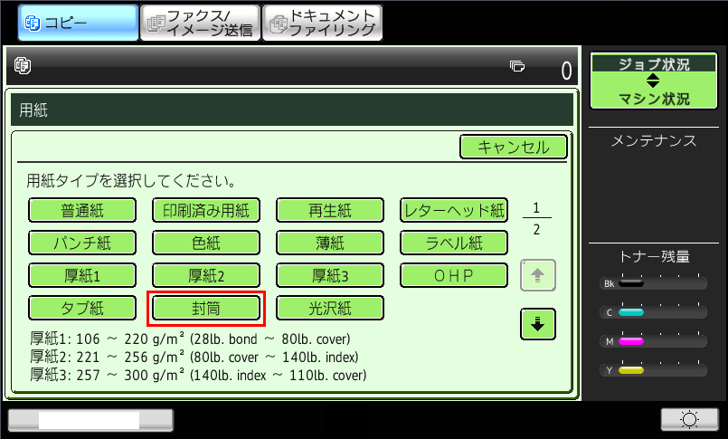 封筒に印刷するには、コピー基本画面の「用紙」画面で用紙タイプを「封筒」に設定して印刷します。