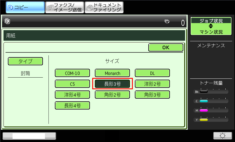 ⑥「用紙のサイズ」画面が表示されますので、[例:長形3号]を選択し、[OK]を押してください。