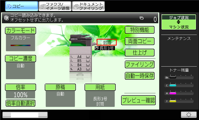 ⑦「複合機」のコピー基本画面で「用紙タイプ」が「封筒」になっていることを確認してください。