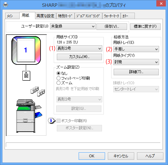 ⑧次にプリンタードライバーの設定画面で [用紙]タブを選択し、下記の機能を設定してください。