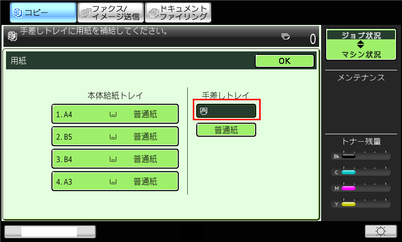 ③「用紙」画面が表示されますので、[手差しトレイ]を選択してください。