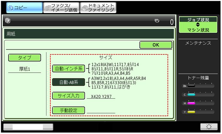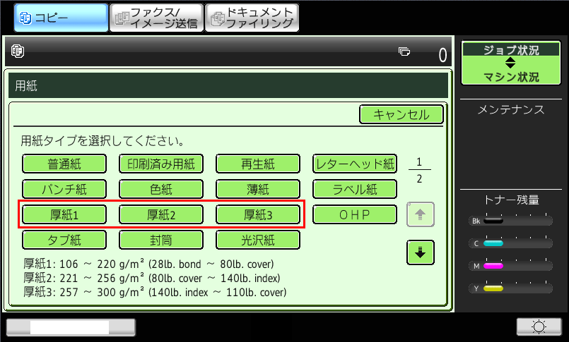 ⑦「複合機」のコピー基本画面で「用紙タイプ」の部分が「例:厚紙1」になっていることを確認してください。
