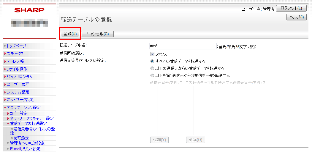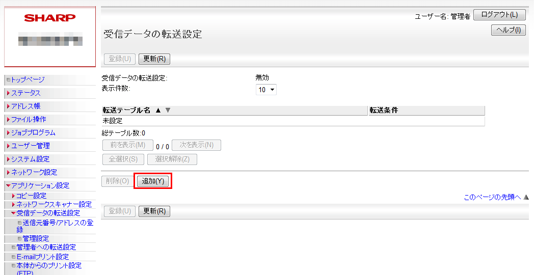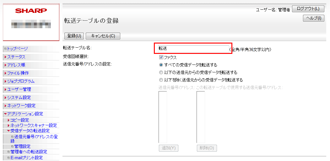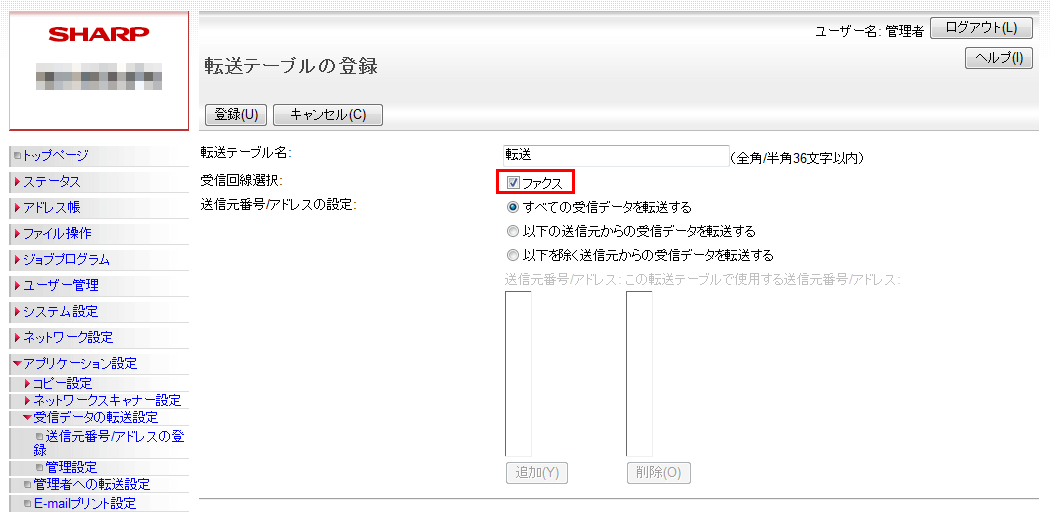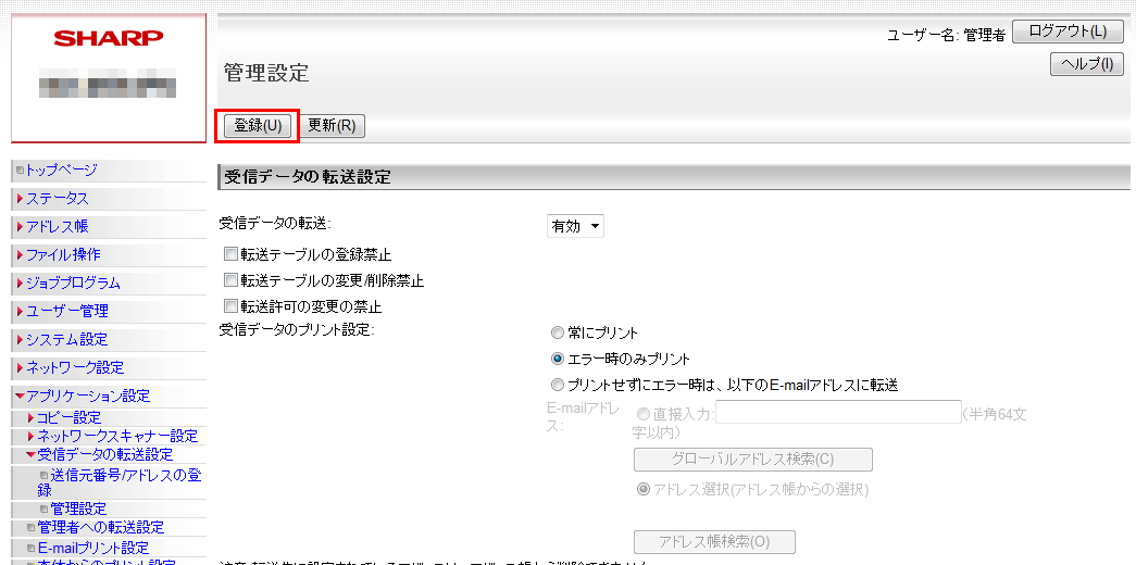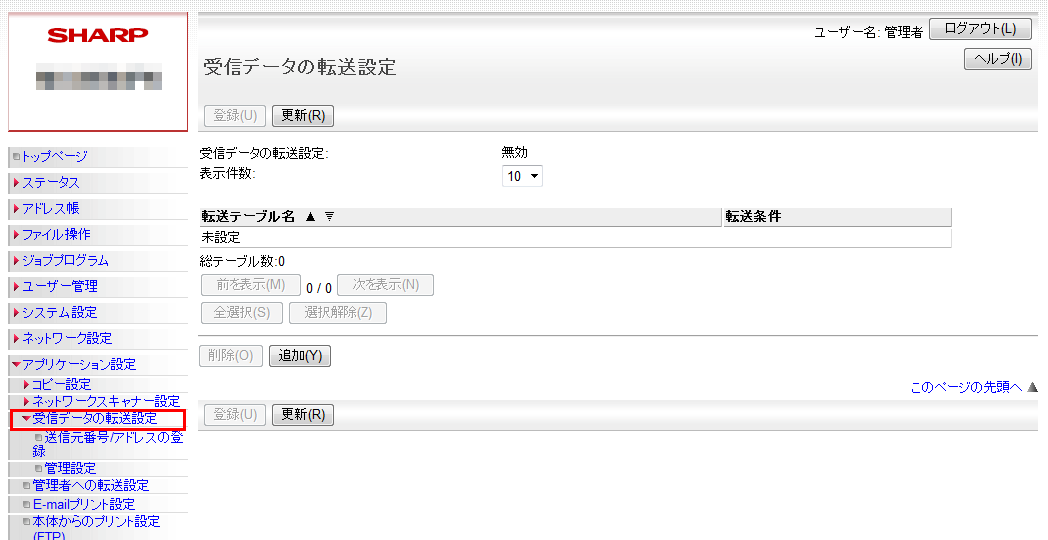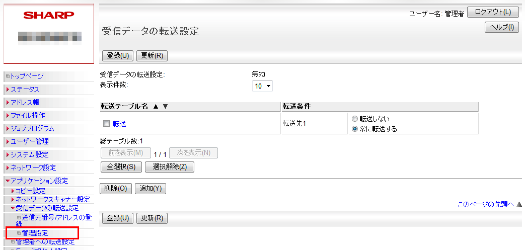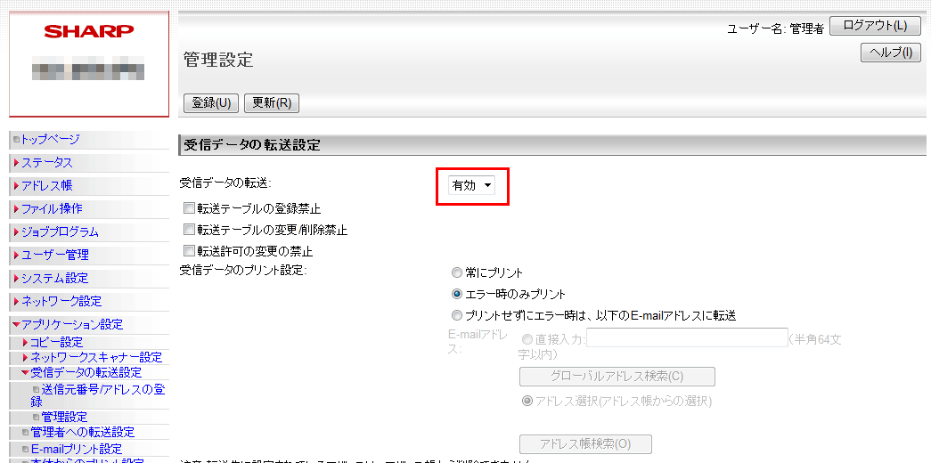 ③「管理設定」画面が表示されますので、「受信データの転送」欄を「有効」に設定してください。