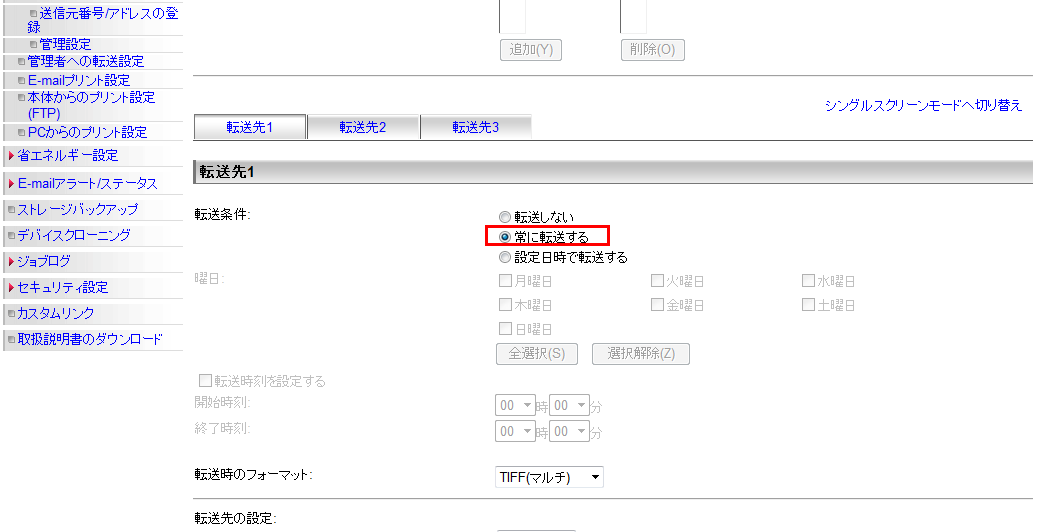④ページをスクロールし、「転送先1」の「転送条件」欄で[常に転送する]を押して、選択状態にしてください。
