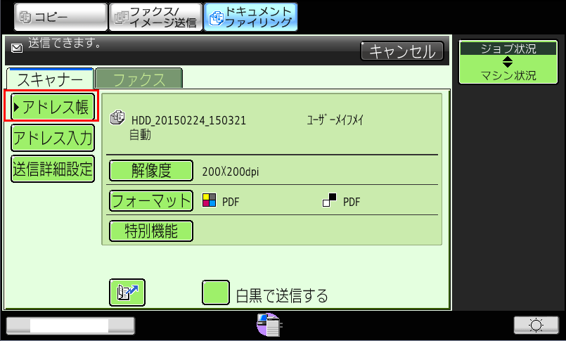 5.送信設定画面が表示されますので、[アドレス帳]を押してください。
