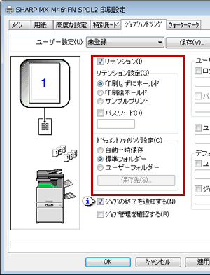 ※([ジョブハンドリング]タブ→「リテンション設定」でプリント→複合機にプリントデータを保存)