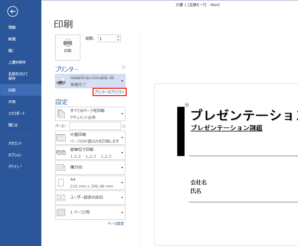 ①アプリケーション(例:Word文書-Office2013-)で[印刷]を押し、