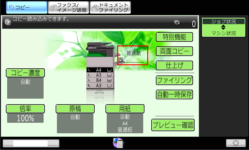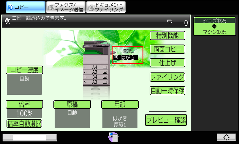 ⑦「複合機」のコピー基本画面で「用紙タイプ」が「厚紙」になっていることを確認してください。