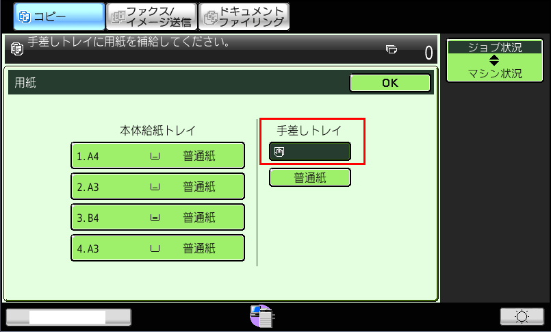 ③「用紙」画面が表示されますので、[手差しトレイ]を選択してください。