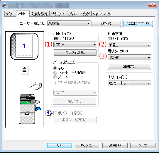 ⑧次にプリンタードライバー設定画面で [用紙]タブを選択し、下記の機能を設定してください。