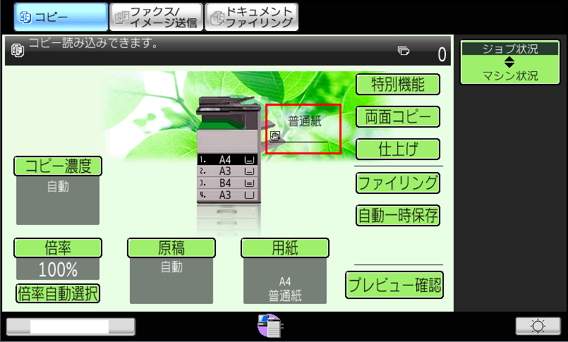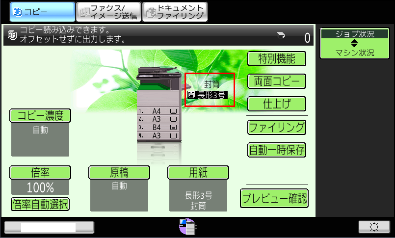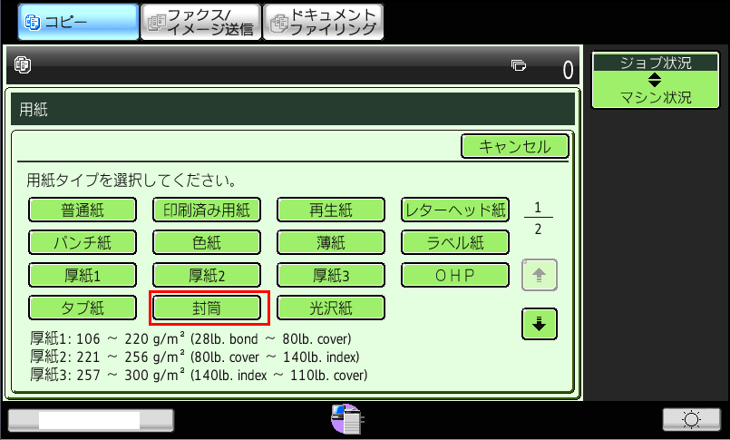 ⑦「複合機」のコピー基本画面で「用紙タイプ」が「封筒」になっていることを確認してください。