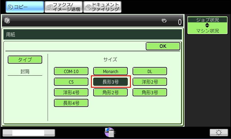 ⑥「用紙のサイズ」画面が表示されますので、[例:長形3号]を選択し、[OK]を押してください。