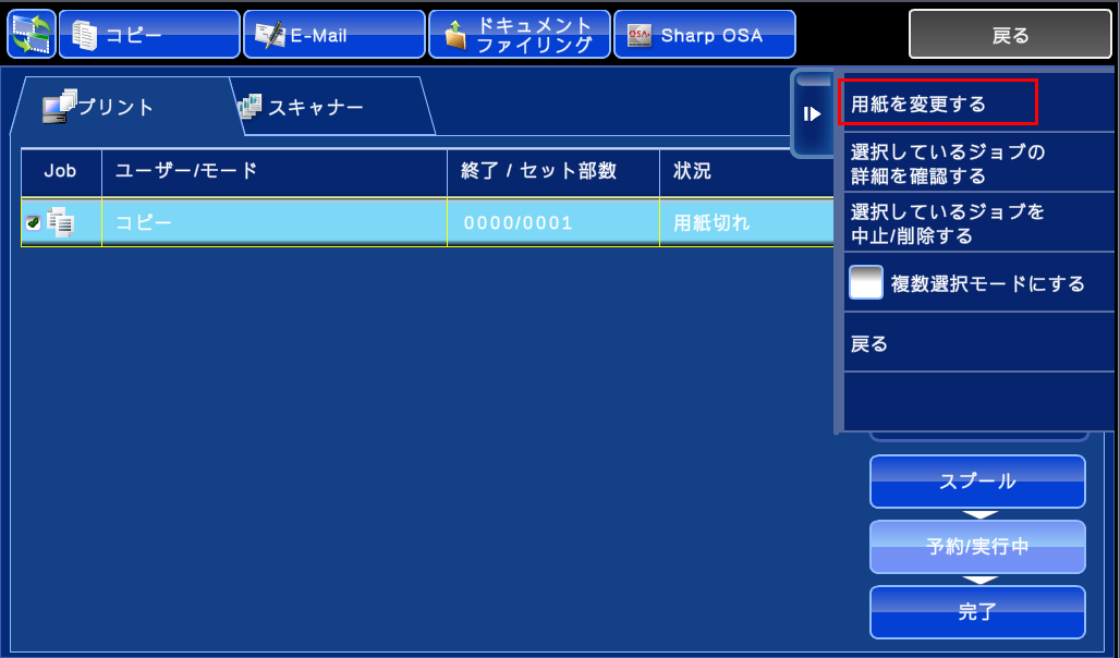 ②[予約/実行中]キーを押し、[用紙切れ]になっているジョブを押してください。