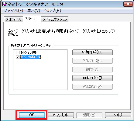 ③自動検知が終了すると、「検知されたネットワークスキャナ」欄に検知結果が表示されますので、スキャナとして利用している「複合機」の名前(またはIPアドレス)を選択してください。
