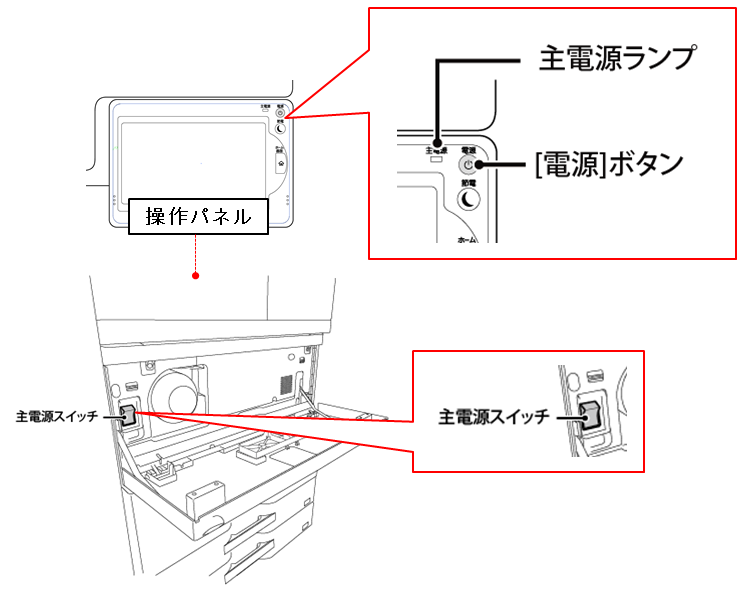 本機の電源は、主電源スイッチ(前カバーを開けた左下)と、[電源]ボタン(操作パネル上)で操作します。