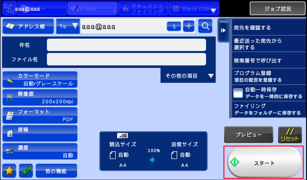※「アドレス帳」からE-mailの宛先を指定する場合は、■「複合機」でスキャンしたデータを、E-mail(アドレス帳)に添付してパソコンに送るには?を参照してください。