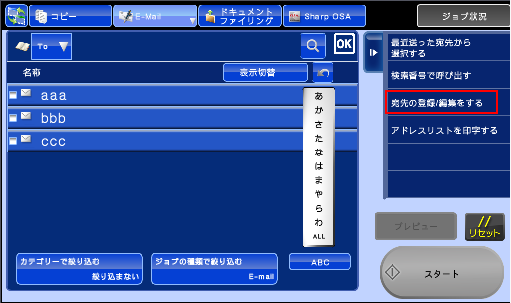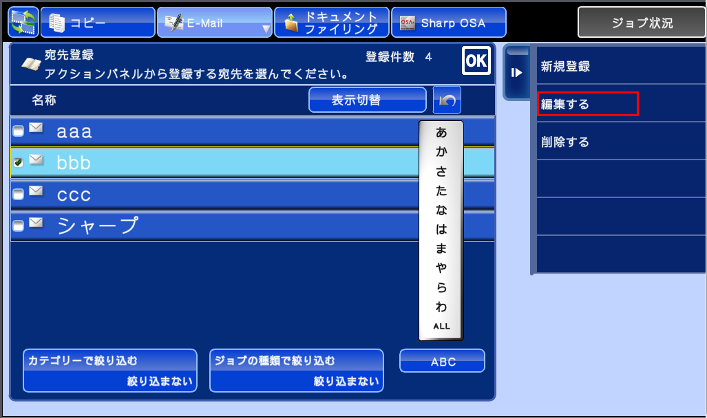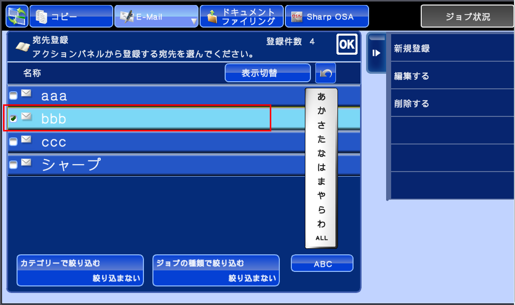 ③「宛先登録」画面が表示されますので、変更したい枠を押し、変更してください。