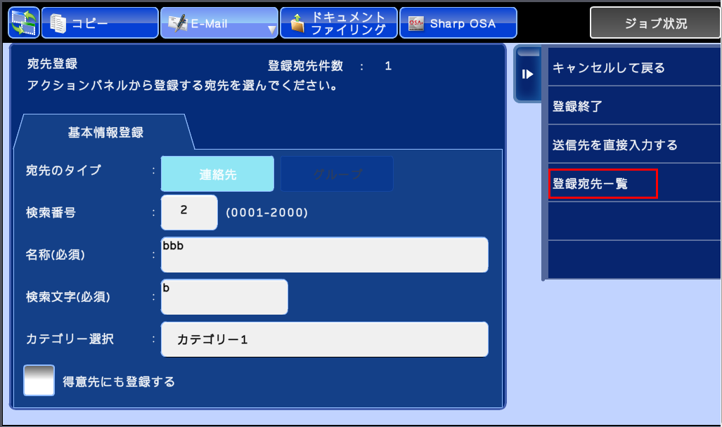 ⑦登録されると、「登録宛先件数」が1つ増え、「以下の宛先を登録」の文字が灰色になります。