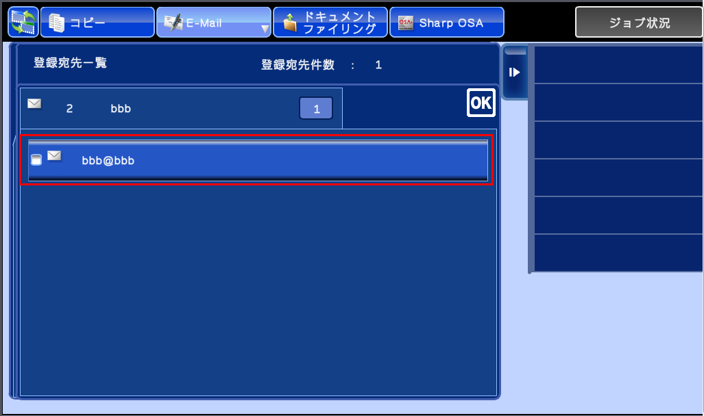⑤登録されている送信先の一覧が表示されますので、変更したい送信先(例:bbb@bbb)を押してください。