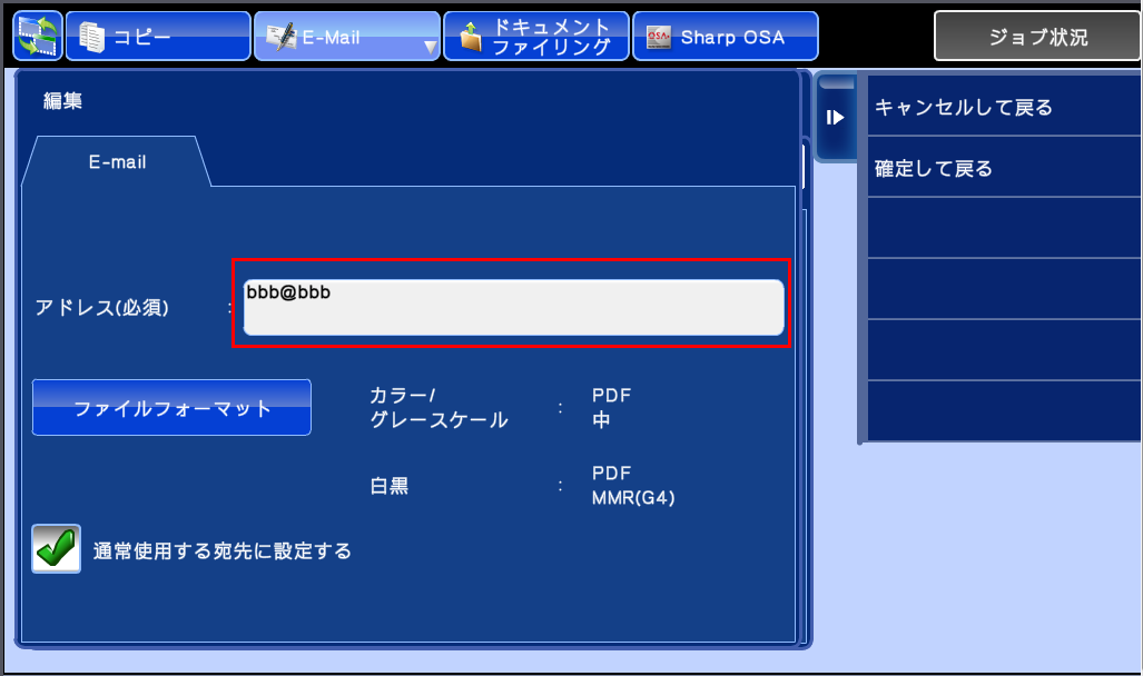 ⑧変更(例:bbb-eee@bbb)が完了しましたら、アクションパネルの[確定して戻る]を押してください。