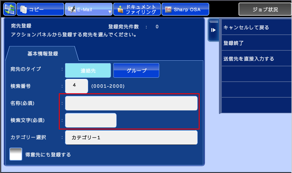 ④「名称(例:シャープ)」「検索文字(例:し)」が入力出来ましたら、アクションパネルの[送信先を直接入力する]を押してください。