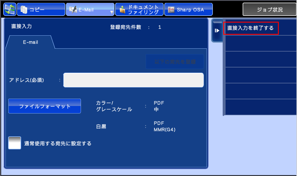 ⑩「宛先登録」画面に戻りますので、アクションパネルの[登録終了]を押してください。