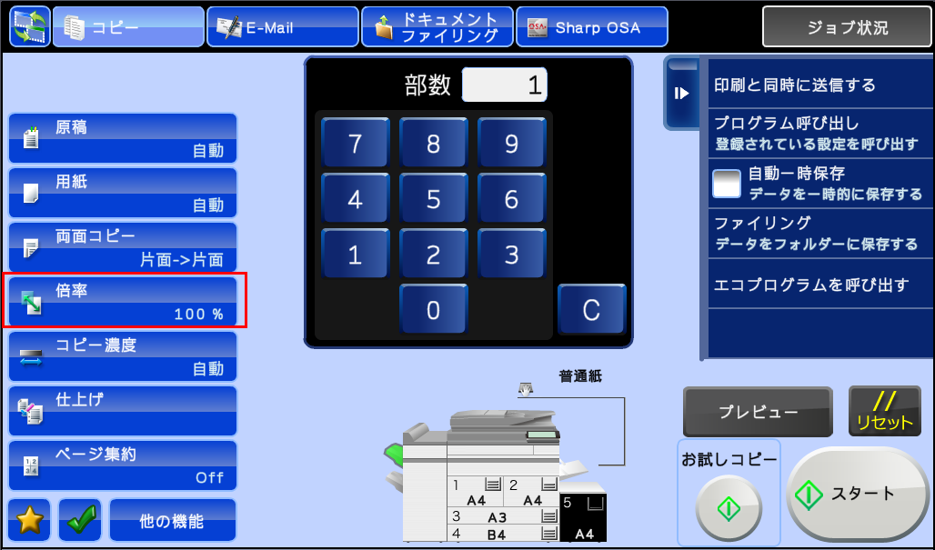 ⑥コピー操作の基本画面に戻りますので、[倍率]にチェックがあることを確認してください。