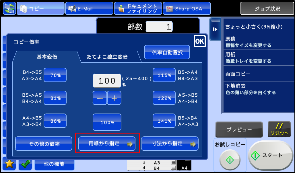 ④「コピー倍率」画面が表示されますので、[用紙から指定]を押してください。