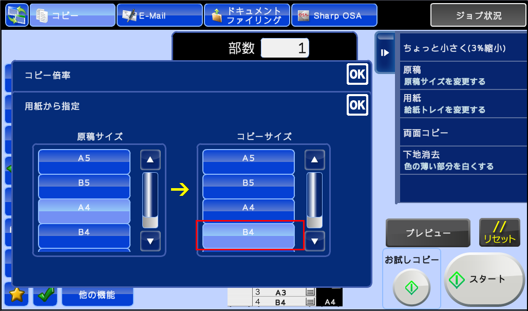 ⑤「用紙から指定」画面が表示されますので、コピーしたい用紙サイズ(例:B4 普通紙)を選択し、[OK]を押してください。