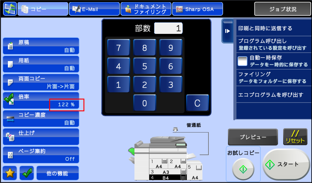 「複合機」がセットした原稿サイズと選択した用紙サイズに応じた拡大/縮小倍率を自動的に計算し、倍率表示部に表示します。