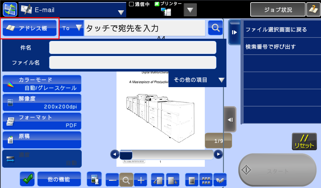 5.E-Mailの画面が表示されますので、[アドレス帳] を押してください。