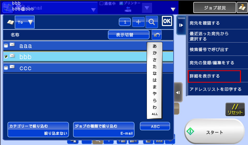6.送信したいE-mailアドレスが含まれている連絡先(例:bbb)を押して、選択状態にし、アクションパネルの[詳細を表示する]を押してください。