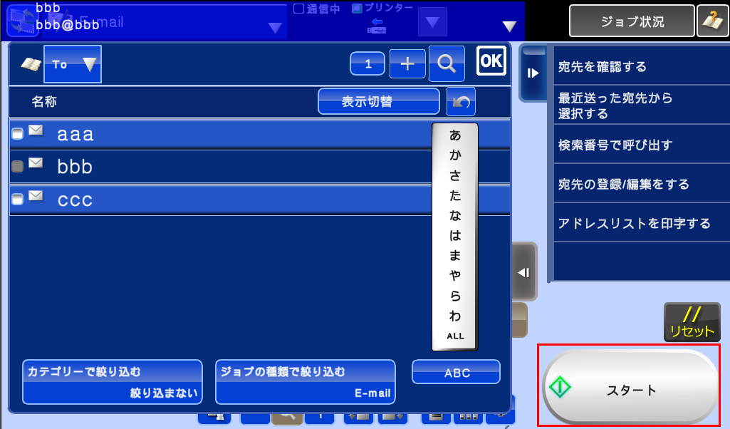 ※E-mailアドレスを直接入力して、宛先を指定する場合は、■「複合機」でスキャンしたデータを、E-mail(直接入力)に添付してパソコンに送るには?の③~④を参照してください。