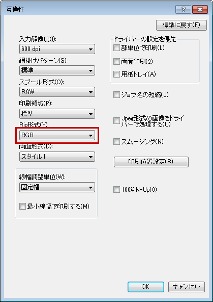 プリンタードライバーの設定により「RGB」か「CMYK」を選択してプリントデータを複合機に保存することができます。([全般]タブ→「基本設定」→[高度な設定]タブ→「互換性」→「Rip形式」)※初期値は「RGB」