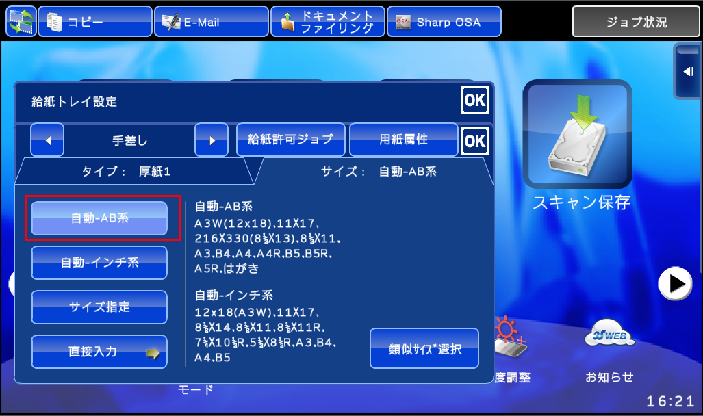 ⑤「サイズ」より、ご使用になる印刷用紙の種類(例:自動-AB系)を選択後、[OK]を押してください。