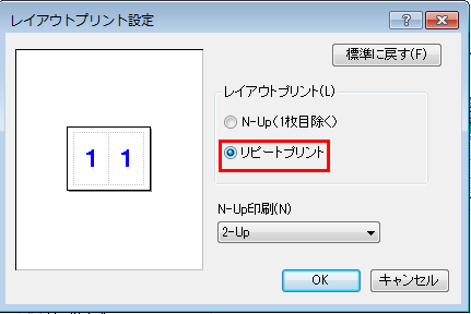 ⑥「レイアウトプリント設定」画面が表示されますので、「レイアウトプリント(L)」の「リピートプリント」をチェックし、「OK」を押してください。