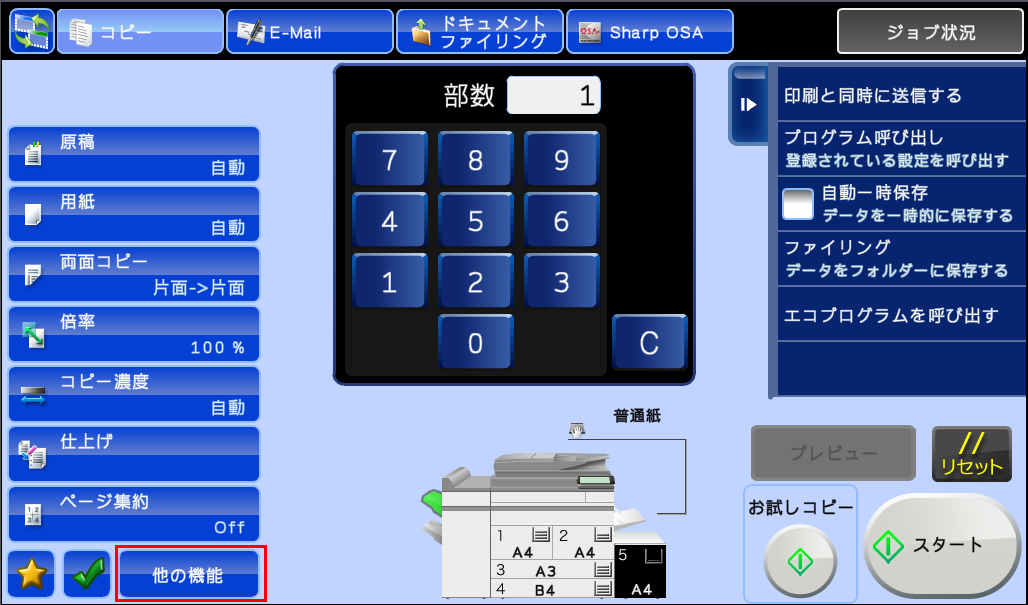 ②コピー基本画面が表示されますので、[他の機能]を押してください。