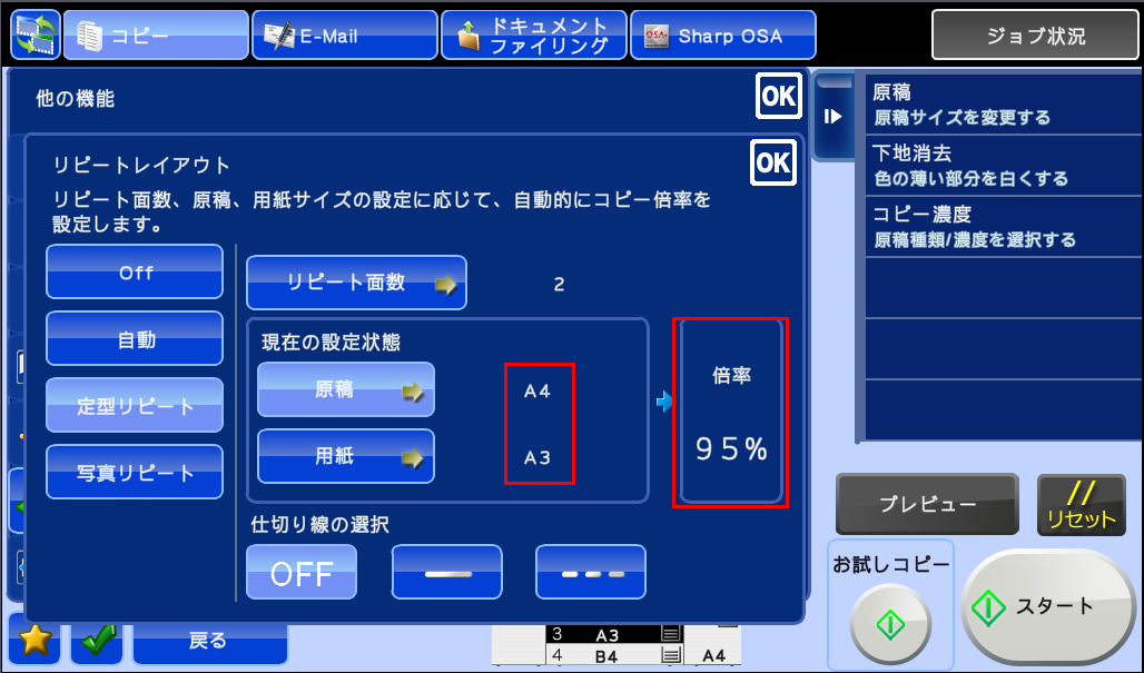 ④「リピートレイアウト」画面が表示されますので、[原稿](例:A4)と[用紙](例:A3)を設定後、倍率が95%になっていることを確認してください。