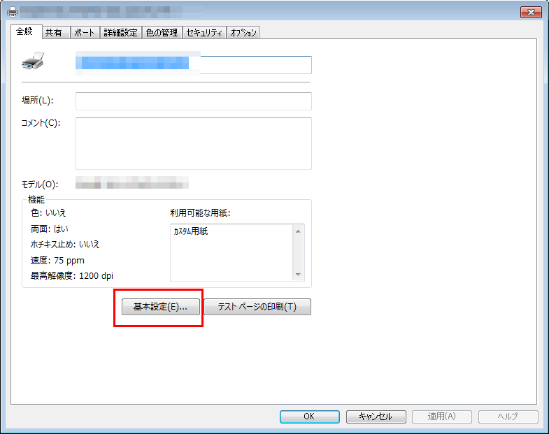③「当該プリンターのプロパティ」画面が表示されますので、[基本設定(E)...]を押してください。