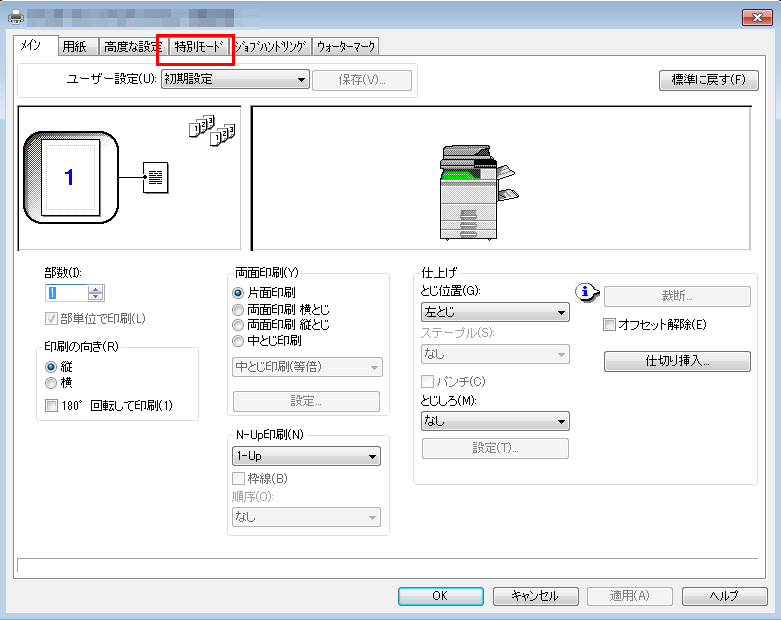 ④「印刷設定」画面が表示されますので、[特別モード]タブを選択してください。