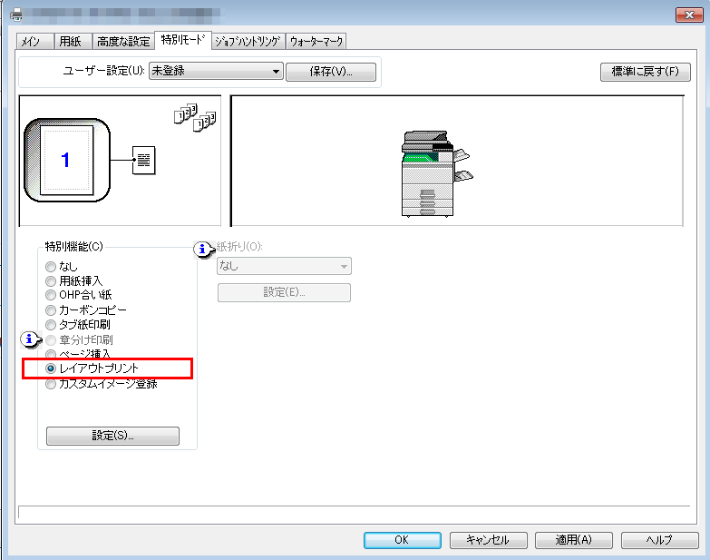 ⑤「特別機能(C)」の「レイアウトプリント」をチェックし「設定(S)」を押してください。