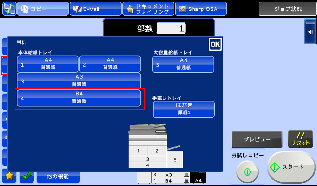 ④「用紙」画面が表示されますので、本体給紙トレイ(例:B4普通紙)を選択して、[OK]を押して下さい。