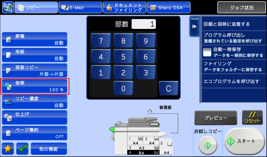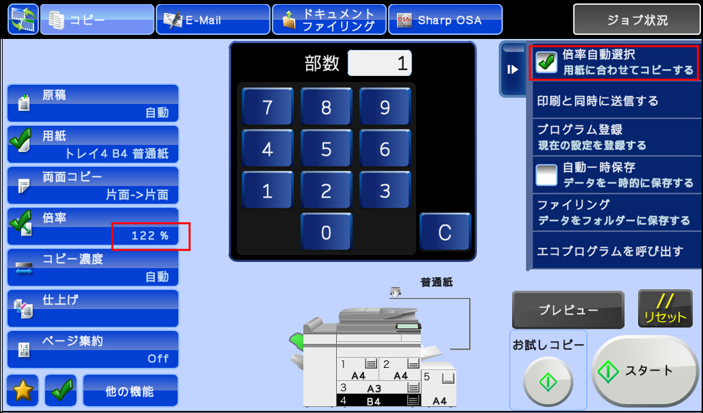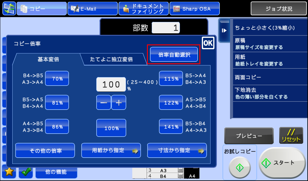 ⑦コピー操作の基本画面に戻りますので、アクションパネルの[倍率自動選択]にチェックが入っていることを確認してください。