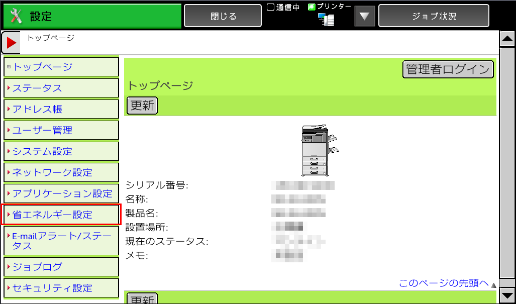 ②[省エネルギー設定]を押してください。管理者ログイン画面が現れるので管理者ログインを行う。「管理者でログインするにはどうすればよいですか?」を実施してください。