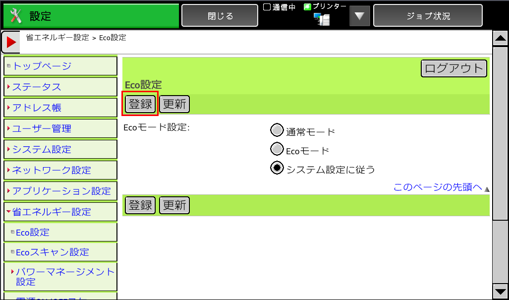 ③「Eco設定画面」が表示されますので、 [システム設定に従う]をチェックし、[登録]を押してください。