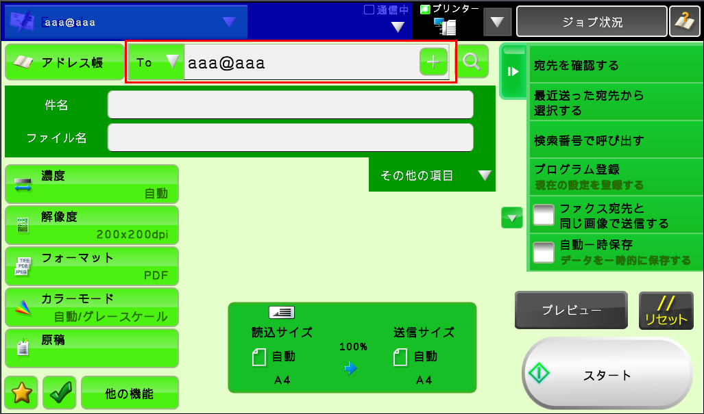 「複合機」でスキャンしたデータを、E-mail(直接入力)に添付してパソコンに送るには?(FAQ No.00612)