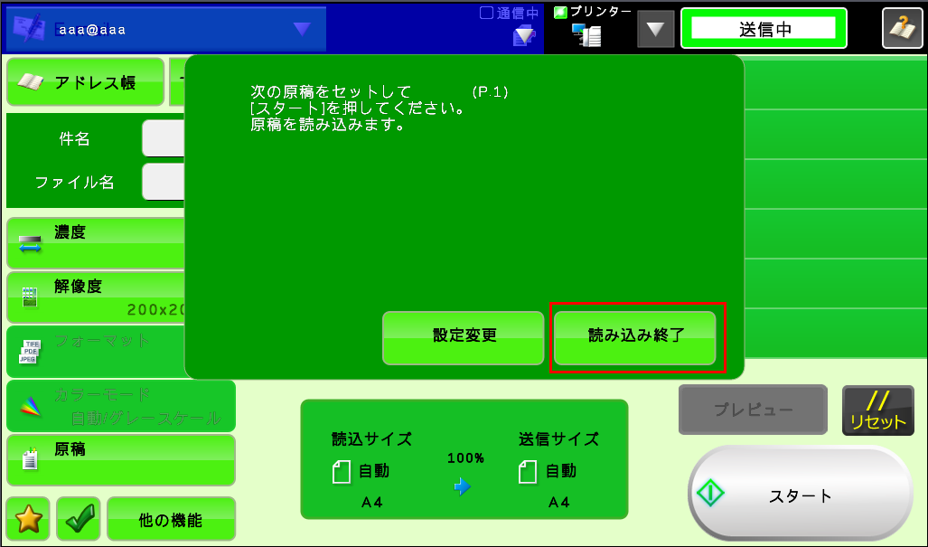 ⑤「次の原稿をセットして[スタート]を押してください。原稿を読み込みます。」が表示されますので、次の原稿がある場合は原稿を入れ替えて[スタート]を押してください。次の原稿が無い場合は[読み込み終了]を押してください。