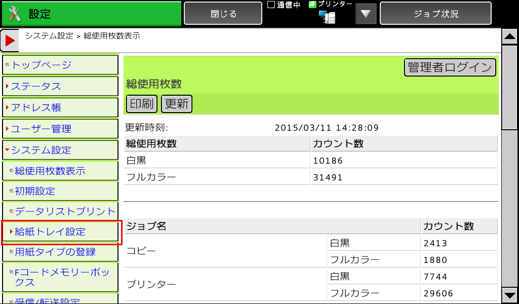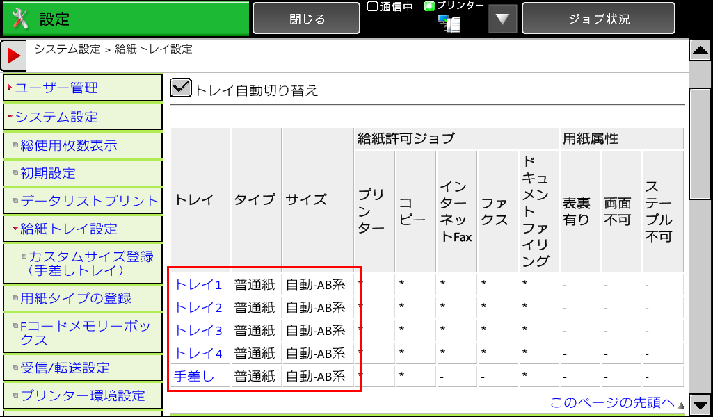 給紙トレイの用紙サイズや用紙タイプの設定は、システム設定の「給紙トレイ設定」画面で変更することができます。