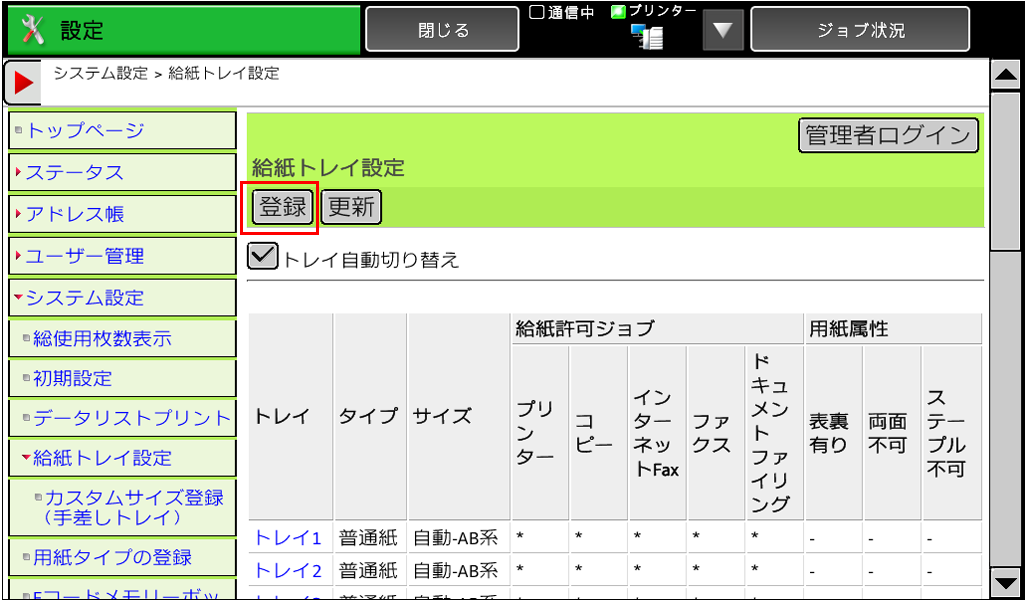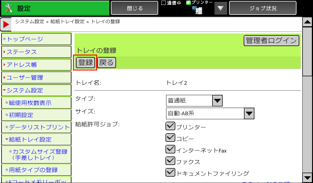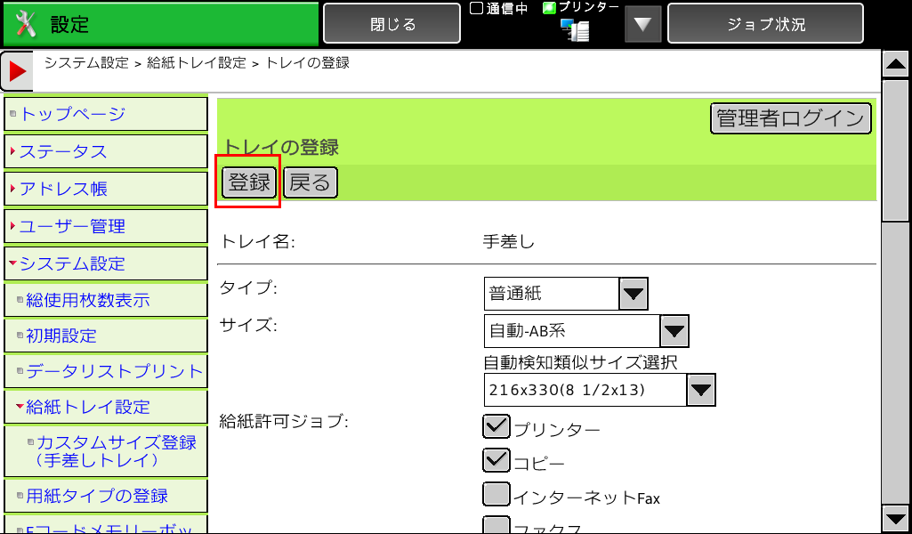 ⑥「給紙トレイ設定」画面に戻りますので、[登録]を押してください。