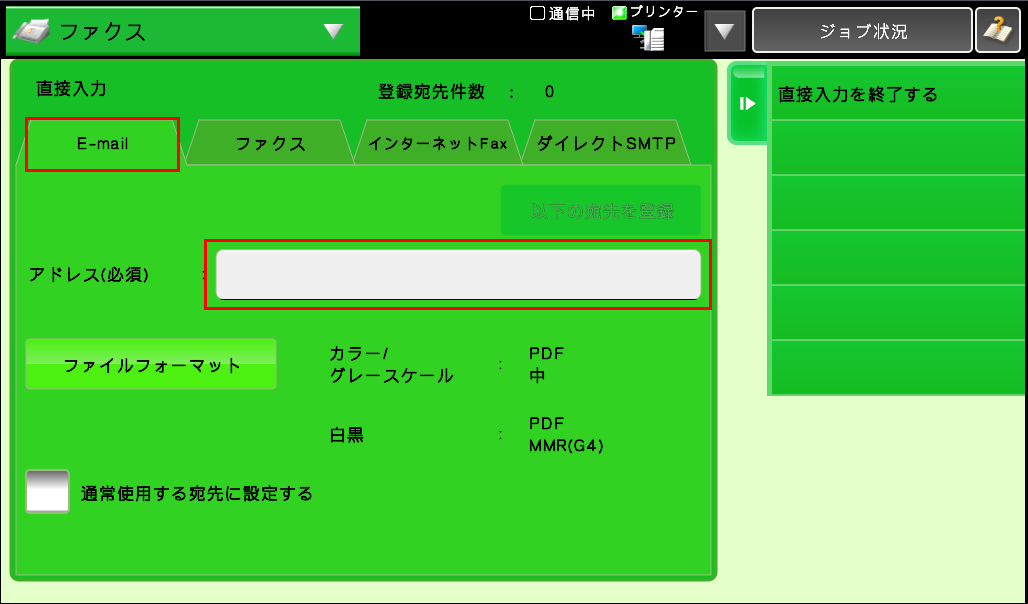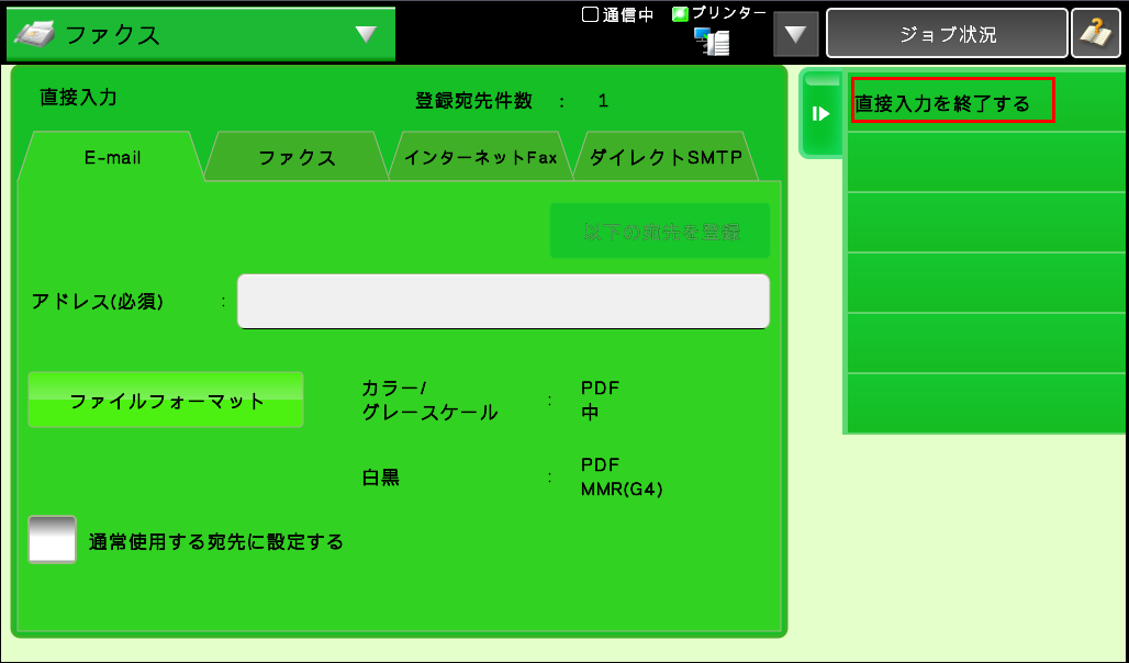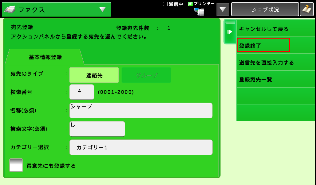 ⑩「宛先登録」画面に戻りますので、アクションパネルの[登録終了]を押してください。